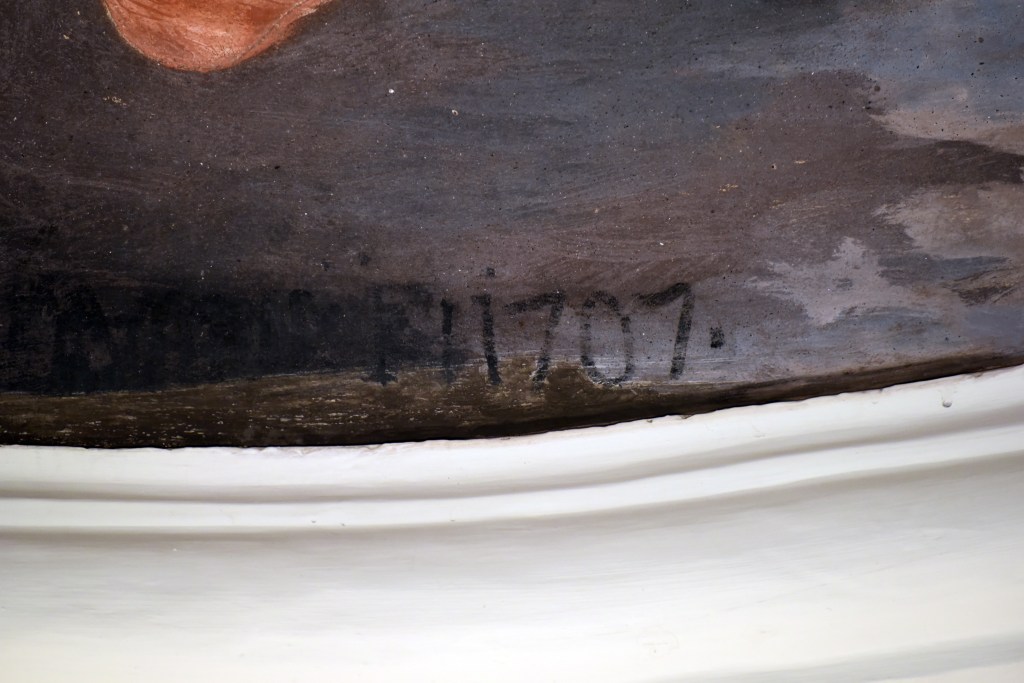 Come ho già accennato la volta, per ovvie ragioni di opportunità, fu eseguita per prima con un ponteggio alto intorno agli otto metri e fu terminato nel 1707 come riporta la scritta visibile nella parte più a sinistra entrando. Il restauratore, Giovanni Salto, ha avuto modo di capire le “giornate di lavoro” impiegate, cioè quei pezzi di pittura che dovevano essere terminati in una giornata. Il mezzo fresco consentiva infatti di continuare il lavoro riprendendolo da dove era stato interrotto. La stima è che ci siano volute almeno 11- 12 giornate di lavoro per terminare.