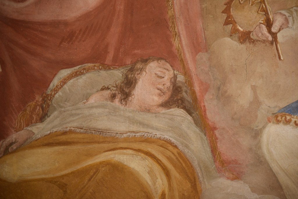 Rimaneva da capire meglio questo quadro, il più piccolo e quello che più di tutti gli altri si è giovato del restauro di Giovanni Salto. Prima era quasi illeggibile e adesso invece si coglie bene la scena. Alessandro sta dormendo nella sua tenda, fuori i soldati, insieme ad un cane, sono di guardia e si scorge la luna tra le nuvole. Alessandro sogna.