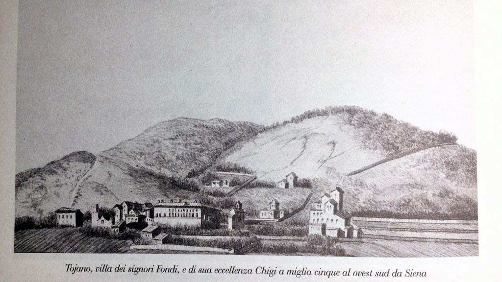 Bene, nel bozzetto che fa di Toiano (siamo nel primo decennio del 1800, dove tra l’altro si nota la cappella di cui ho già parlato), la villa viene definita: villa de’ Sig.ri Fondi e di sua Eccellenza Agostino Chigi. I Fondi, famiglia che aveva delle proprietà nelle vicinanze, non risultano essere mai stati proprietari della villa e si può pensare che l’abbiano avuta in affitto dal Chigi.