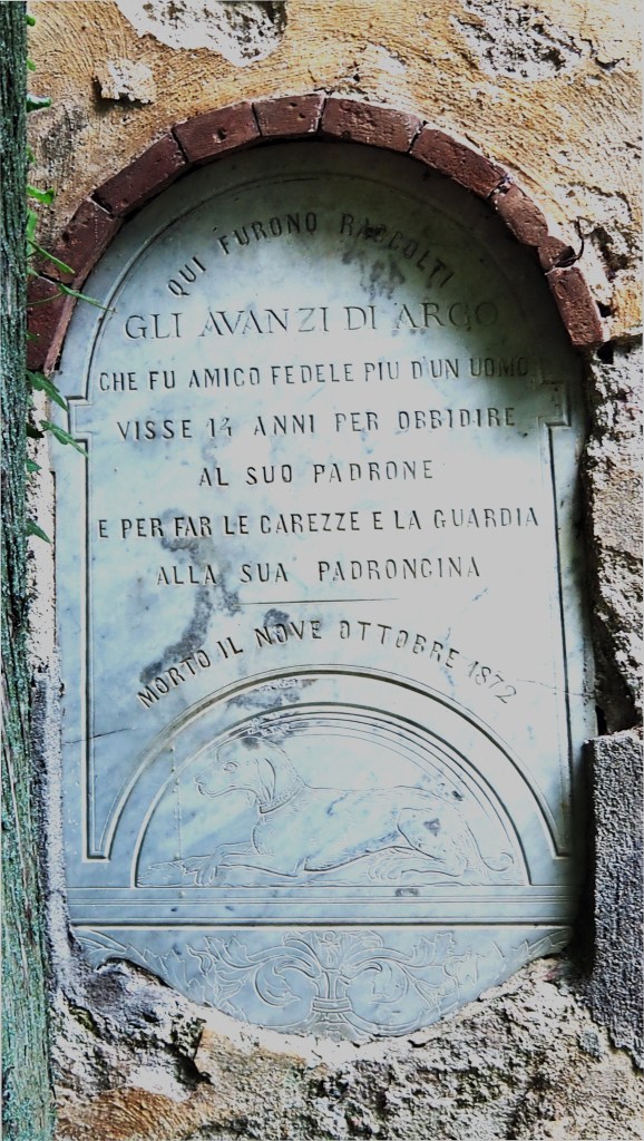 Nella sua vita Ortensia deve aver trascorso diverso tempo a Toiano, anche se forse non è mai stata la sua residenza, che era a Cortona. La citazione nella tomba del cane Argo presente in un angolo del parco dovrebbe riguardare lei, che all’epoca aveva poco più di 10 anni (…la padroncina…) e che con quel cane si deve esser fatta compagnia nel giardino di Toiano.