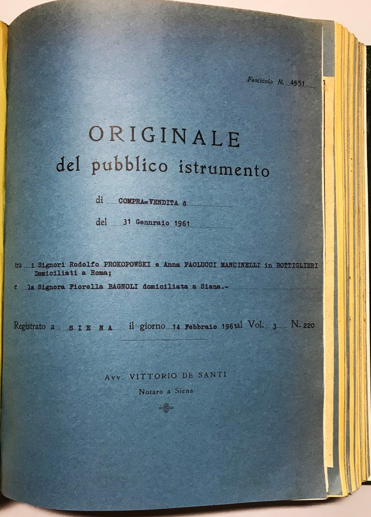 Ed allora ricordiamo qualche passaggio. Il 31 Gennaio 1961, presso lo studio del notaio Vittorio De Santi, in Diacceto, si trovano tre, quattro persone. Due sono i compratori, Mario Friscelli, medico, e Fiorella Bagnoli, sua moglie, a cui il bene sarà intestato. I venditori, un gruppo nobiliare romano, non sono presenti fisicamente ma vengono rappresentati dal loro delegato, Delfo Balocchi, a Siena ben conosciuto per il suo lavoro di mediatore e faccendiere, ma anche per essere il fratello di Enzo Balocchi che farà una discreta carriera politica.